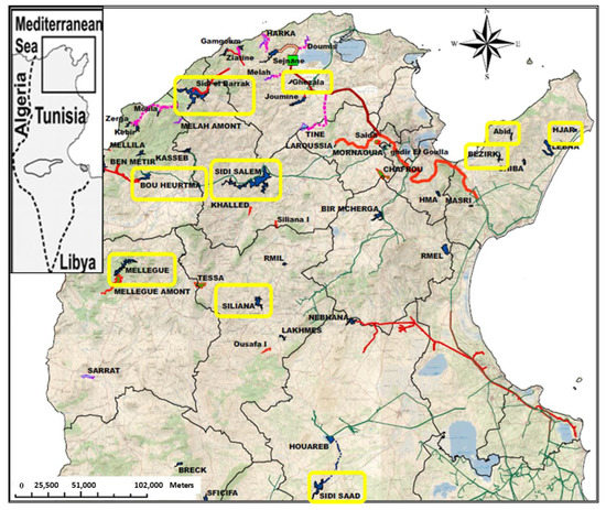 Locations of the most important Tunisian reservoirs (yellow boxes: studied reservoirs).