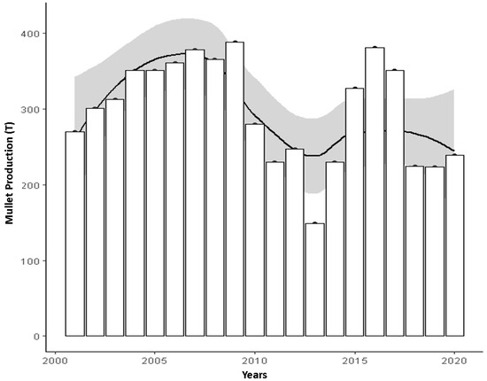 Evolution of the mullet harvest in Tunisia from 2001 to 2020. The solid line represents the predicted value of the dependent variable as a function of the x-axis. The gray band represents ±2 standard errors.