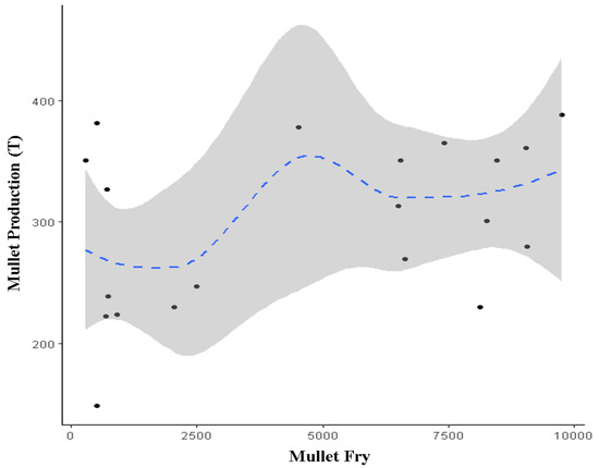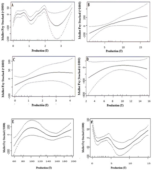 Generalized additive models (GAMs) were applied to assess the correlation between the quantity of mullet fry stocked and the mullet harvest in the Tunisian reservoirs [19]. GAMs can be considered a nonparametric generalization of linear regressions that are increasingly being used to study nonlinear relationships between the covariates and the response variable [20].
