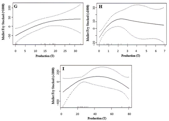 Generalized additive model depicting the correlation between mullet production and mullet fry stocked. The solid line represents the predicted value of the dependent variable as a function of the x-axis. The dotted lines represent ±2 standard errors. (A) Seliana; (B) Bouheurtma; (C) Lahjar; (D) Mellegue; (E) Sidi Salem; (F) Laabid; (G) Sidi Barrak; (H) Bezirekh; (I) Sidi Saad.