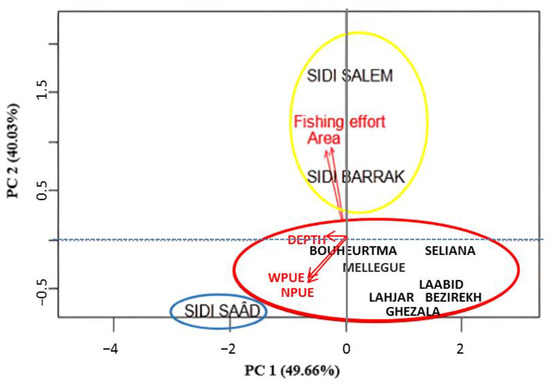 Principal component analysis (PCA) applied to the biotic parameters (biomass and catch of mullet (WPUE and NPUE)) and abiotic parameters (depth, area, and fishing effort) (PC1 = 49.66, PC2 = 40.03) in the Tunisian reservoirs (Red arrows). Three mullet groups: I (Red circle), II (Yellow circle), and III (Blue circle).