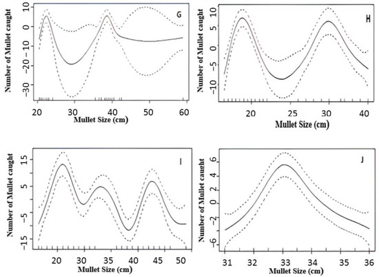 Generalized additive model depicting the relationship between mullet abundance and size (total length: TL). The solid line represents the predicted value of the dependent variable as a function of the x-axis. The dotted lines represent ±2 standard errors. (A) Lahjar; (B) Sidi Saad; (C) Seliana; (D) Mellegue; (E) Sidi Salem; (F) Sidi Barrak; (G) Laabid; (H) Ghezala; (I) Bezirekh; (J) Bouheurtma.