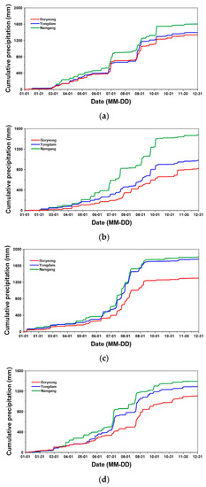 Figure 2 compares the daily rainfall time series for those three dam basins from 2018 to 2020. This figure shows that the overall patterns of rainfall are similar to each other. However, the annual rainfall amounts differ somewhat. Boryeong Dam basin in the northernmost location of the three dam basins shows the smallest annual rainfall, while Namgang Dam basin in the southernmost location shows the highest. The annual rainfall in Yongdam Dam basin lies between the two. However, in 2018 and 2019, the annual rainfall in Yongdam Dam basin was closer to that in Boryeong Dam basin, and in 2020 and 2021, it was closer to that in the Namgang Dam basin. In those four years, the annual rainfall in the Boryeong Dam basin was around 1000 mm, but was 1400 mm in the Yongdam Dam basin and 1600 mm in the Namgang Dam basin. In all three basins, the variation of annual rainfall was found to be very high, with standard deviations of 200 mm or more. Even though there was high variation of annual rainfall, their order was not reversed.