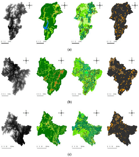 Figure 3 shows the overall characteristics of the three basins. Yongdam Dam basin is located in a high land area, but Boryeong Dam and Namgang Dam basins are located in low land areas near the sea. All three dam basins are mostly covered in forest, along with some farmland, paddy fields, and small urban areas. As most dam basins in Korea are strictly protected to secure clean water, it is not easy to develop an urban area within a dam basin. The soil composition in all three dam basins is also similar. The portion of loam (brownish brown in the figure) is much higher than that of sand (brown) or silt (light brown). Some rock area is also noticeable in the Yongdam Dam basin.