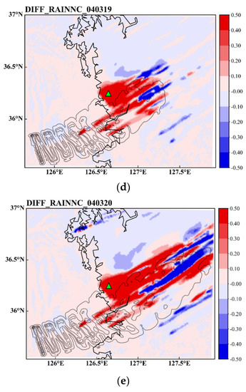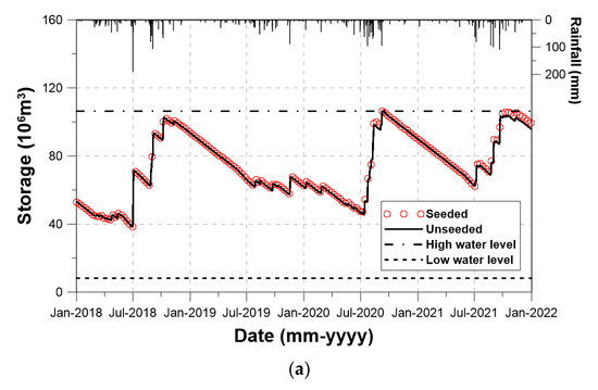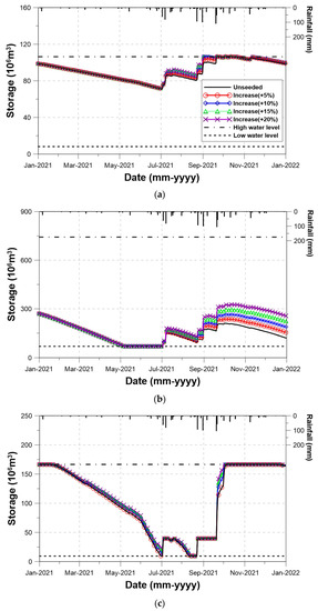 During the four years of simulation, the water level in Boryeong Dam was higher than the low water level. That is, during this simulation period, no water shortage occurred in Boryeong Dam. However, in the Yongdam Dam basin, the water level stayed around the low water level for almost one year from July 2019. A severe water shortage problem continued in this dam, but the cloud seeding somewhat alleviated the problem. Even though the water level became higher due to cloud seeding, this effect was not that vivid in this figure. The situation in the Namgang Dam was also similar to that in the Yongdam Dam. Due to the small increase rate of rainfall, the effect of cloud seeding could not be clearly detected. Also, during the wet summer season, frequent release from the dam reservoir to secure the flood control volume kept the Namgang Dam from securing the additional water resource by cloud seeding. This was the fundamental limitation of the Namgang Dam, with its large basin area but very small storage capacity.