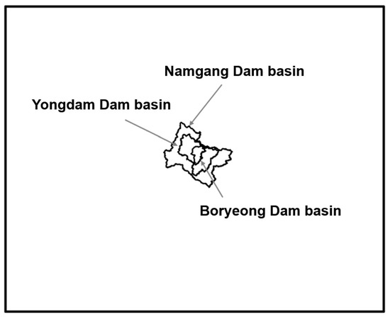 49]. First, due to its small size, the Boryeong Dam basin was considered as a single basin. The Yongdam Dam basin, with its basin area of 930.0 km