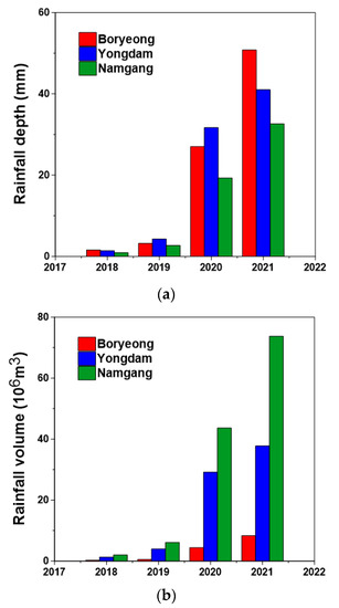 2, much larger than that of the Boryeong Dam basin. In the same year, 2015, the water storage of Yongdam Dam also receded to be just 25.4%, due to the small annual rainfall of 877.6 mm in the basin. This amount of rainfall was just 67.5% of the normal year’s rainfall of about 1300 mm [