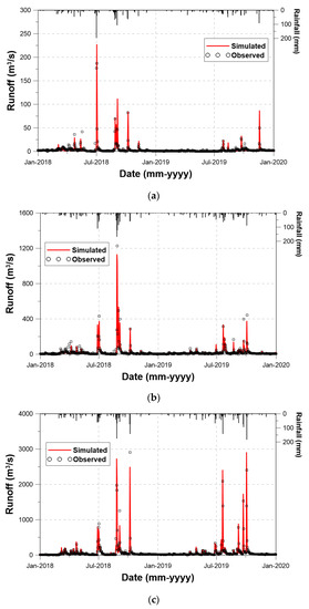 Table 4, the rainfall–runoff analysis for the three basins was conducted properly. In the case of Boryeong Dam basin, the observed and simulated mean runoffs are 3.6 and 3.5 m