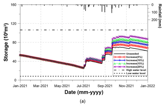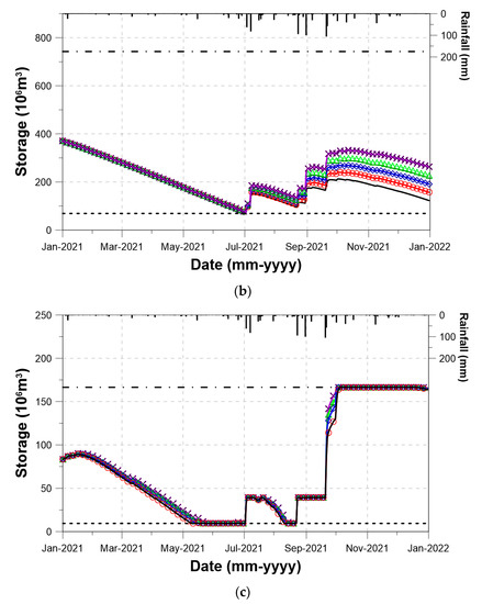 Section 6.2 is repeated in this section, but with the scenario-based rainfall data. As explained earlier, the four different scenario-based rainfall data were prepared by considering a 5, 10, 15, and 20% increase to the rainfall data in 2021. The runoff data simulated by the PRMS model were applied to the corresponding dam. The initial water stage in each dam was assumed to be the same as that at the end of 2020.