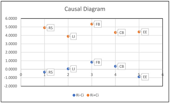 The total relation matrix is presented in Table 12, where the row sums are represented by and the column sums by , and Table 13 exhibits the cause-and-effect relationship between the five key criteria (refer to Figure 2).