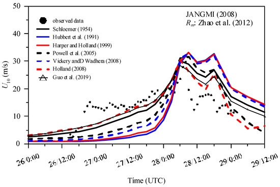 Then, use the of [19] with different Holland-B parameters, taking typhoon JANGMI as an example. The observation data and simulation results of the Hsinchu buoys are shown in Figure 3. The X-axis represents the time (UTC) and the Y-axis represents the wind speed at an altitude of 10 m. The black dots in the figure are observation data, the black line is the simulation result using [22], the blue line is [23], the red line is [24], the black dashed line is [15], the blue dashed line is [17], the red dashed line is [14], and the black triangle is [8]. According to the typhoon warning issued by CWB, the warning time of typhoon JANGMI is 2008.09.26 15:00~2008.09.29 15:00 (UTC). As shown in Figure 3, the simulation results before 06:00 on the 28th are all smaller than the observation data, and only the simulation results of [8,18] are relatively close. In addition, the maximum wind speed simulation results show that the results are more accurate. The results of the other five Holland-B parameters are overestimated, and the worst occurs when using [23]. The observation data and simulation results of the Longdong buoy are shown in Figure 4. As shown in Figure 4, the simulation results before 00:00 on the 28th are smaller than the observation data, but the simulation results of [8,14] are relatively similar, followed by the results of [22]. In addition, the simulation results of the maximum wind speed show that the simulation results of [22] overlap with the observation data, the results of [8,14] are slightly lower, and the simulation results of the other five types are higher. In addition, as shown in Figure 3 and Figure 4, the simulation results using [23,24] are almost overlapped. Using [17], it is slightly larger than the simulation results of [23,24] before the wind speed reaches the maximum value. However, the simulation results almost overlap until the wind speed gets smaller. Overall, using the of [19], the variation trends of the seven Holland-B parameters are similar. The simulation results of 20 typhoons were used in this study to verify the Hsinchu and Longdong buoys. The absolute values of the relative errors are 0.17 and 0.14, respectively, showing that the results are roughly consistent.