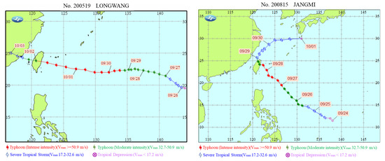 In this study, typhoon data from CWB were selected, and typhoons after AD 2000 were used to verify the observation data and model. For those typhoons that have a slight impact on Taiwan and lack observation data, after elimination, they can be sorted into the typhoons in Table 2 for analysis. In Table 2, JMA No. is the typhoon number according to JMA BTD. The first 2 numbers are the last 2 digits of the AD year, and the last 2 numbers are the generation number of the typhoon in this year. The intensity of the typhoon is classified according to the CWB standard, and the classification is based on the maximum average wind speed in Table 3. Part of the track map of the verified typhoon is shown in Figure 2, and the source of the picture is CWB. In Figure 2, the colors of typhoon tracks represent typhoons of different intensities: blue line for mild typhoon, green line for moderate typhoon, and red line for severe typhoon.
