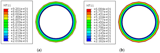 Figure 3 shows the lining temperature variation diagram. As can be seen from Figure 3a, after the excavation of the tunnel was complete, the temperature of the contact surface between the outer side of the lining and the soil was 92 °C. The modulus of elasticity of the liner decreased at high temperatures, and there was a difference of 71.98 °C from 20.02 °C on the inside of the liner. Large temperature gradients tend to produce large temperature stresses, and care should be taken during construction. Figure 3b shows that after 50 days of operating, the temperature of the outer liner contact surface with the soil was 60.84 °C: a significant reduction of 33.87% compared to when the excavation was completed. Figure 3c shows that after 100 days of operating, the temperature at the contact surface between the outer liner and the soil was 55.82 °C: a decrease of 8.25% compared to the temperature at 50 days of operating. This indicates that the temperature drop at the contact between the liner and the soil was greater in the early stage when the temperature difference between the liner and the soil was larger and slowed down in the later stage when the temperature difference decreased.