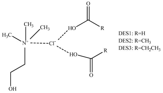 DESs were synthesized by mixing ChCl (as an HBA) with three short-chain acids (as HBDs) at a molar ratio of 1:2, respectively. Three kinds of DESs, including ChCl-formic acid (DES1), ChCl-acetic acid (DES2), and ChCl-propionic acid (DES3), were synthesized in screwed bottles. The mixture of ChCl and different HBDs was heated and stirred at 80 °C in a water bath until a clear liquid was formed. The synthesized DES structures are shown in Figure 1.