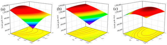 Effects on the total peak area of the 16 PAHs. Interaction between parameters of (a) X1 and X2, (b) X1 and X3, and (c) X2 and X3. X1: volume of 1-dodecanol (μL), X2: volume of DES2 (μL), X3: ultrasound time (min). The colors in the figure go from purple to dark blue to baby blue to green to yellow and then to red, indicating an increase in the response value of the total peak area of the 16 PAHs.