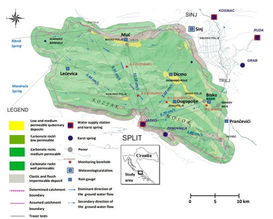 - Kapelj, S.; Kapelj, J.; Švonja, M. Hidrogeološka obilježja sliva Jadra i Žrnovnice. Tusculum 2012, 5, 205–216. [Google Scholar]