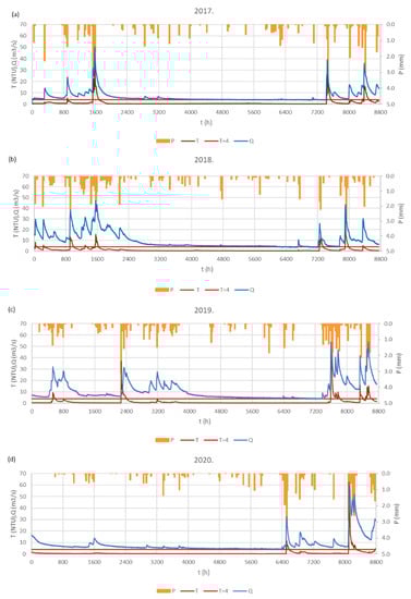 Time series of hourly discharge (Q) and turbidity (T) of the Jadro Spring, and daily rainfall at the meteorological station, Dugopolje (P) for the years: (a) 2017, (b) 2018, (c) 2019, (d) 2020. The red line represents the permitted turbidity (T) value of 4 NTU.