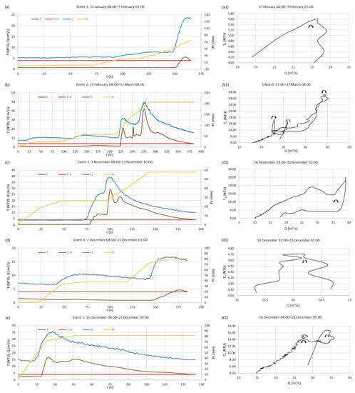 Hysteresis loops generally enable insight into the development of one physical variable about another [,]. They are often used to describe the relations between sediment concentration and discharge during single flood events for rivers, and to provide possible explanations for their occurrence []. In this study, the method has been slightly adjusted by replacing Cw − Qw with Te − Q hysteresis loops. Four major types of Te − Q hysteresis loops were identified and explained. A single-valued line was not present.