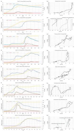 An overview of all hysteresis loop types obtained for the analyzed events is presented in Table 7, where ΔTemax,Qemax represents the time difference between tbTemax and tbQemax so it has a sign depending on whether Qemax is reached first or not. Seven events had a clockwise hysteresis loop: 1, 4, 7, the first sub-event of event 13, 15, and the third sub-event of event 16. In event 15, exceeding turbidity Te peaks evidently before discharge Q (the time difference between their peaks ΔTemax,Qemax is −71 h). Event 15 also has a high value of maximum turbidity Temax of about 37 NTU, and a long duration of turbidity exceedance te of 147 h. In the remaining six events, Te and Q have rather simultaneous peaks (ΔTemax,Qemax is between −4 and 5 h). The clockwise loops of these six events are characterized by a low value of Temax (about 5 NTU), a short duration of te (from 4 to maximum 16 h), and the value of maximum in discharge Qemax below 31 m3/s.