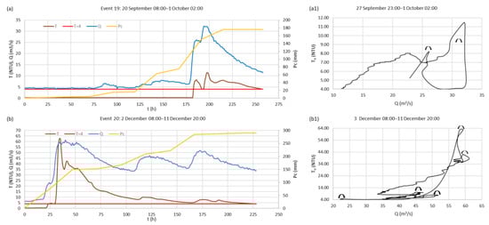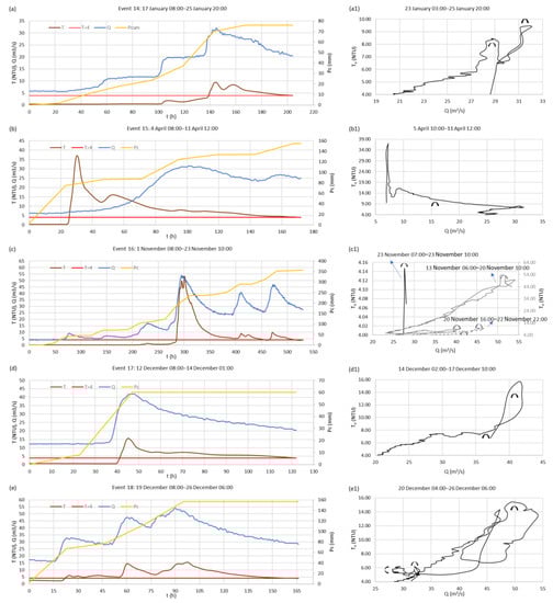 Graphical presentations of time series of turbidity, discharge, and cumulative rainfall for each event are presented in Figure 3a–e (events 1–5), Figure 4a–h (events 6–13), Figure 5a–e (events 14–20), and Figure 6a–b (events 19–20). The obtained Te − Q hysteresis loops are presented in Figure 3a1–e1 (events 1–5), Figure 4a1–h1 (events 6–13), Figure 5a1–e1 (events 14–20), and Figure 6a1–b1 (events 19–20). It is noticeable that most events are characterized by the occurrence of two or more peaks in turbidity. Generally, increases and decreases in turbidity including primary peaks mainly follow increases and decreases in discharge, but there are also secondary peaks in turbidity that are not supported by peaks in discharge (events 2, 3, 5, 10, 11, 12, 14, 15, 16, 17, 19, and 20). Increases in cumulative rainfall are not always followed by increases in discharge. There are episodes of rainfall at the beginning of rainfall events that are accumulated in soil and epikarst zone, or spent on evapotranspiration, so they do not affect significantly discharge and turbidity. Whence the water capacity of soil and epikarst zone is fulfilled, discharge and turbidity follow cumulative rainfall and they rise continuously to maximum values. The exceptions are events 11 and 15. In event 11, although the cumulative rainfall was constant after the first turbidity peak, turbidity reached its maximum in the second peak after 33 h. Event 15 is characterized by the appearance of two significant turbidity peaks but, unlike in other events, both peaks appear much before the peak in discharge.