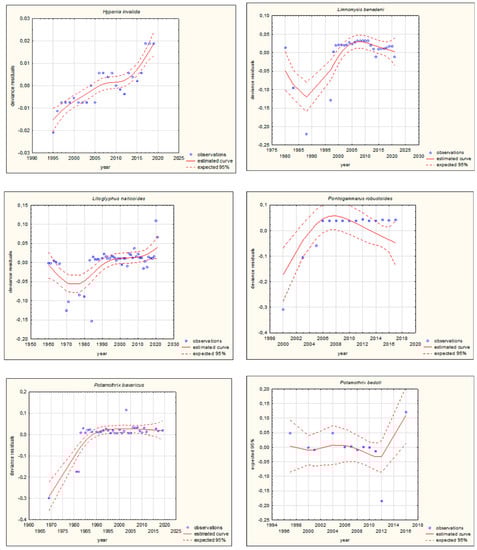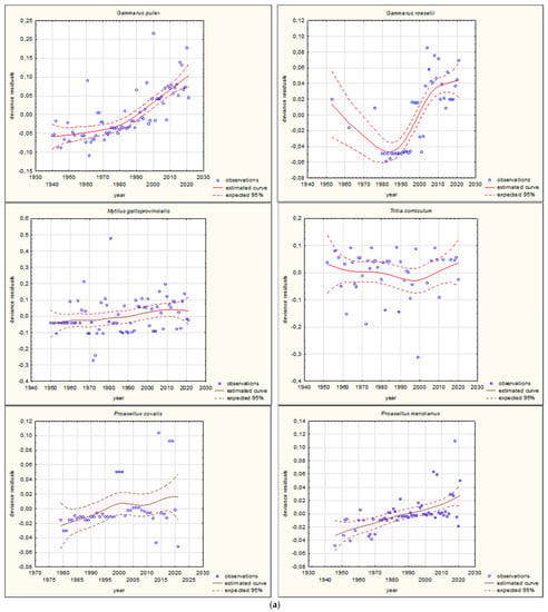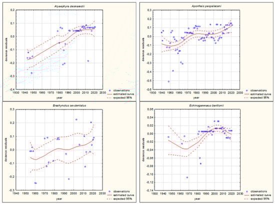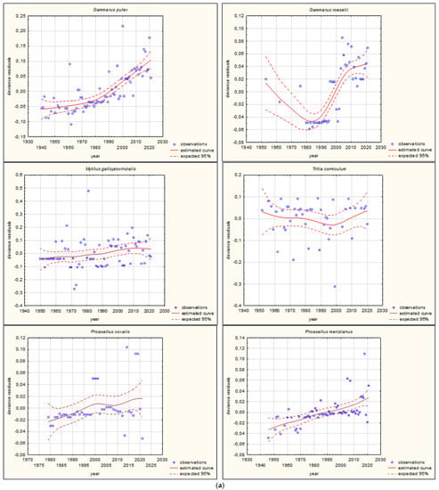 Thus, the available occurrence data from 1940 to 2021, depending on research/monitoring/reporting efforts, were processed. The trends of movement over time were determined using the maximum latitude in a year (northern extent) and/or the minimum latitude in a year (southern extent) (among all records of distributions in the GBIF database) of Mediterranean and Ponto-Caspian aquatic alien invertebrate species. Using occurrence data (degrees), a generalised additive model (GAM) approach was used to determine changes in the maximum/minimum latitude of occurrence of a species in the analysed years for evidence of species movement. The GAM models provide a useful tool to visualise the nature of the relationship between changes in the geographical distribution of a species over time. Latitudinal movements of the northern and southern limits were noticed (for species that moved north and south). For changes in geographical occurrences of particular species over time, the gamma distribution with log link function and categorisation was used. Estimates of movement (if sufficient data were available) were prepared due to the described methodology [43,44]. This GAM-based analysis was prepared using the Statistica 10 version. The shapes of the movements for the species were plotted. Additionally, the direction of species movement (northward and/or southward) was indicated based on information based on country of occurrence from GRIIS (Global Register of Introduced and Invasive Species) [38].