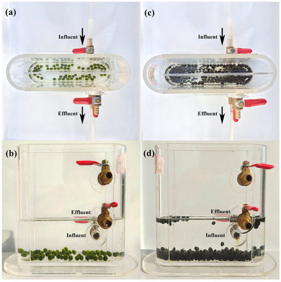 The marimo and MBGS used in this experiment were derived from the internet and our previous experiment [24], respectively. The granule sizes of marimo and MBGS were about 7.1 and 7.0 mm, respectively. The 5-min sludge volume index (SVI5) values of marimo and MBGS were about 20.9 and 41.8 mL/g, respectively, and the initial volatile suspended solids (VSS) of marimo and MBGS were about 3.9 and 2.5 g/L, respectively. The hydraulic retention time (HRT) was set as 4 h. The experimental device was a continuous flow system shown in Figure 1, with an effective volume of 340 mL and a water depth of 5 cm for the runway pool. The influent flowed into the lower inlet of the device and discharged from the 5 cm high outlet. The experiment was conducted under a fixed artificial light source for 12 h/12 h of light/dark cycles, with an indoor temperature of 20 °C and a light intensity of 180 μmol/m2/s. The effluent samples were collected from one light cycle and one dark cycle per day and passed through a 0.45 μm filter for further analysis. At the beginning and end of the experiment, granule samples were collected for physicochemical analysis and metagenomics sequencing.