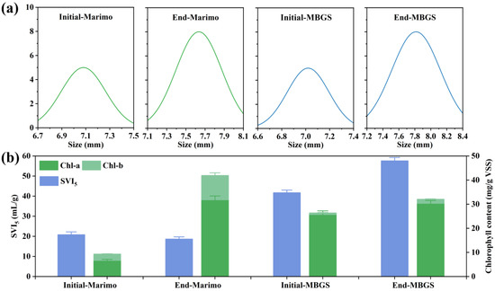 The granule size (a), SVI5 value and Chl content (b) of marimo and MBGS at the beginning and end of the experiment.