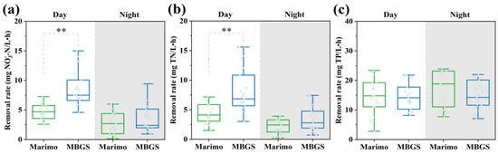 Differences in removal rates of NO3−-N (a), TN (b), and TP (c) between marimo and MBGS during the day and night. ** symbols for p < 0.01.