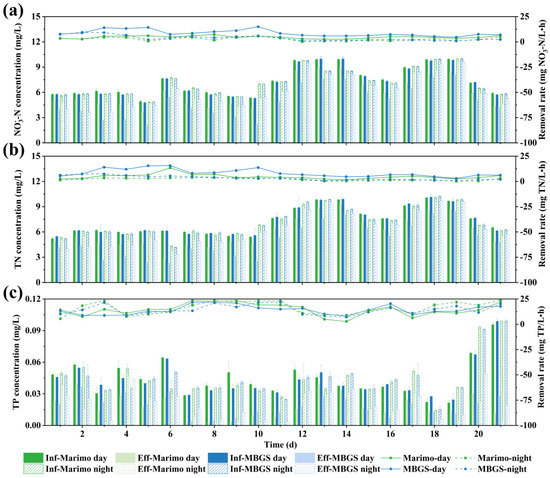 NO3−-N (a), TN (b), and TP (c) influent and effluent concentrations (left axis) and removal rates (right axis) by marimo and MBGS.