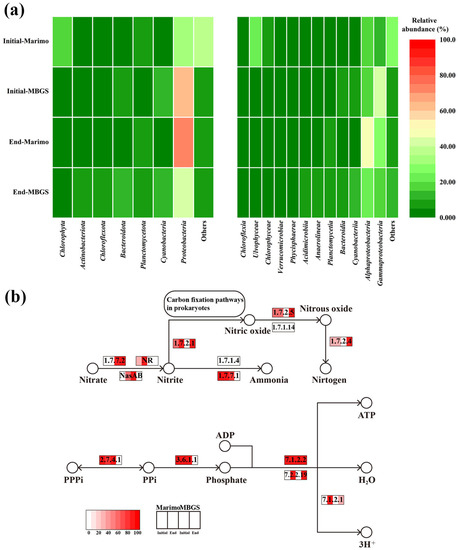 Changes in microbial communities (a) and key metabolic pathways of nitrate and phosphate (b) of marimo and MBGS.