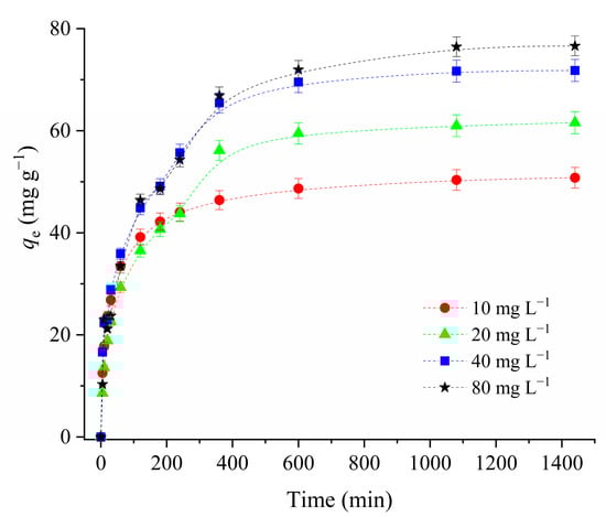 3.2.3. The Effect of the Initial CIP Concentration and Kinetic of Adsorption Process