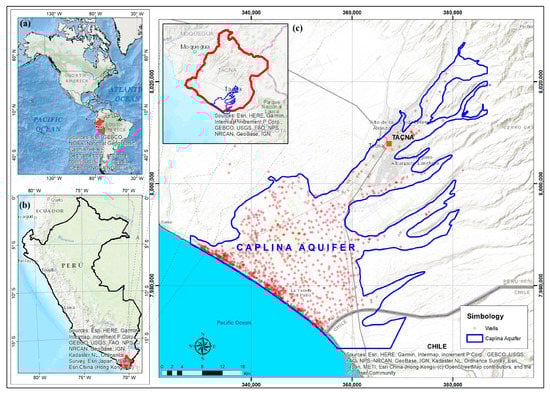 Location of the study area. (a) The Atacama Desert, (b) Caplina Aquifer, southern Peru, and (c) the Caplina aquifer in the Caplina basin.
