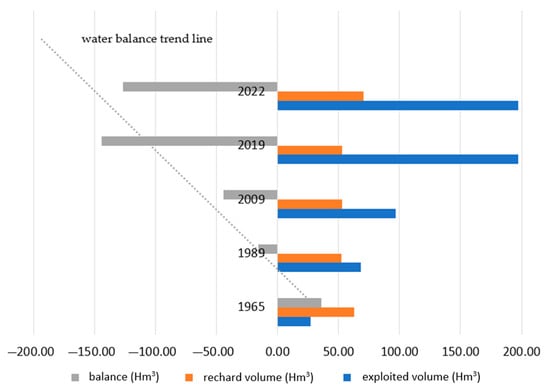 The Caplina aquifer system will continue to be unsustainable for the next 20 years, regardless of the exploitation scenarios that are imposed, and it is suggested that any mitigation measures require the participation of stakeholders [31]. Figure 2 shows the evolution of the water balance for the Caplina aquifer; this information has been generated by various institutions for the period 1965 to 2022. Table 3 shows the data collected and the institutions that report them: in 1965, the National Institute for Mining Research and Development (INIFM); in 1989, the Tacna Special Project (PET), attached to the National Development Institute (INADE); in 2009, the Geological, Mining, and Metallurgical Institute (INGEMMET); and in 2019 and 2022, the National Water Authority (ANA).
