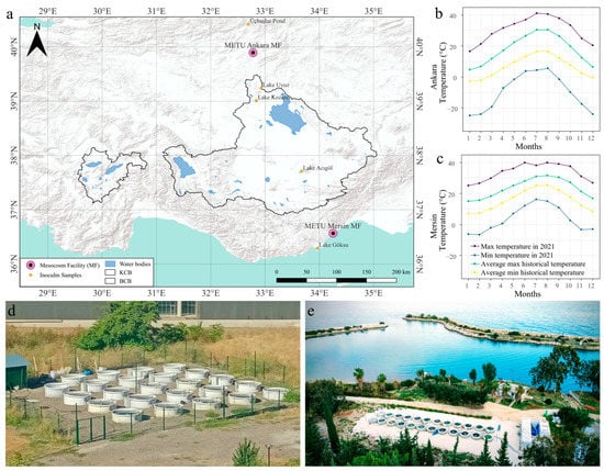 The two mesocosm facilities (MF) were established in the central Anatolian plateau and on the Mediterranean coastline to cover two dry climatic regions (a). Monthly variations of minimum and maximum air temperatures from Ankara (b) and Mersin (c) are shown as average historical data (1981–2010) and data from 2021. Aerial photos of the facilities in Ankara (d) and Mersin (e) are given below.