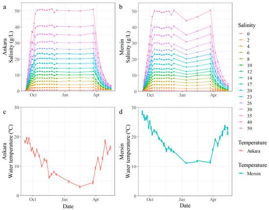 Temporal changes in salinity (a,b) and average water temperatures (c,d) in the 16 different treatments of the gradient experiment in the Ankara and Mersin mesocosm facilities, respectively.