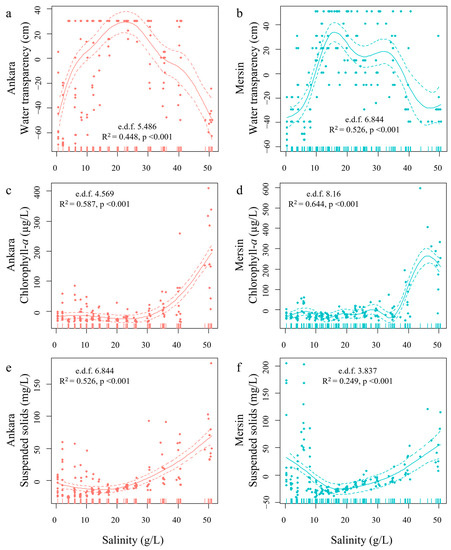 Response variable values estimated through generalized additive models (GAM) for Secchi disc water transparency (a,b), chlorophyll-a concentrations (c,d), and total suspended solids (e,f) in Ankara and Mersin, respectively, and their response to the salinity gradient in the stable phase of the experiment. Effective degrees of freedom (e.d.f), R-squared (adjusted), and significance of the relationships (p-values) are provided. Solid lines are the estimated response variables and dashed lines represent the 95% confidence intervals. All models were highly significant (p < 0.001).