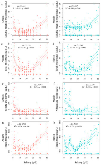 Response variable values estimated through generalized additive models (GAM) for soluble reactive phosphorus (a,b), total phosphorus (c,d), nitrite and nitrate (e,f), and total nitrogen (g,h) in Ankara and Mersin, respectively, and their response to the salinity gradient in the stable phase of the experiment. Effective degrees of freedom (e.d.f), R-squared (adjusted), and significance of the relationships (p-values) are provided. Solid lines are the estimated response variables and dashed lines represent the 95% confidence intervals. All models were highly significant (p < 0.001).