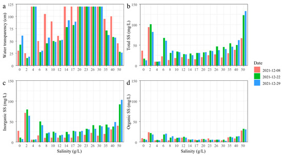 Variation of water transparency (a), total (b), inorganic (c), and organic (d) fractions of suspended solids (SS) in the mesocosms over time (8–29 December 2021) before and after the fish removal in the mesocosm with 0 g/L salinity on 8 December.