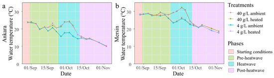 The water temperature changes in the ambient and heated mesocosms with salinities of 4 and 40 g/L in Ankara (a) and Mersin (b). The heatwave period started on 22 September and reached 6 °C compared to the ambient temperature in reference mesocosms on 26 September.