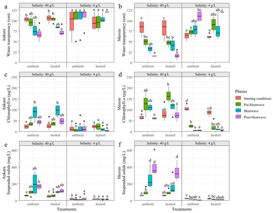 Variation of water transparency (a,b), chlorophyll-a (c,d), and suspended solids (e,f) in the treatments with 4 and 40 g/L salinity crossed with ambient temperatures and heatwave treatments at the start of the experiment, at the beginning (Pre-Heatwave), during (Heatwave), and after (Post-Heatwave) the heatwave period in Ankara and Mersin mesocosm facilities. Boxplots are given with black lines representing the median, the limit of the boxes representing the 25th and 75th percentiles, and dots are the outliers. Different letters represent significant differences between the treatments and phases.