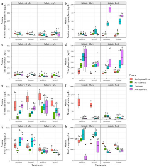 Variation of soluble reactive phosphorus (a,b), total phosphorus (c,d), nitrite and nitrate (e,f), and total nitrogen (g,h) in the treatments with 4 and 40 g/L salinity crossed with ambient temperatures and heatwave treatments at the start of the experiment, at the beginning (Pre-Heatwave), during (Heatwave), and after (Post-Heatwave) the heatwave period in Ankara and Mersin mesocosm facilities. Boxplots are given with black lines representing the median, the limit of the boxes representing the 25th and 75th percentiles, and dots are the outliers. Different letters represent significant differences between the treatments and phases.