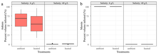Macrophyte percent volume infested (PVI%) in Ankara (a) and Mersin (b) and their response to the factorial salinity and heatwave treatments at the end of the experiment. Boxplots are given with black lines representing the median, the limit of the boxes representing the 25th and 75th percentiles, and dots are the outliers.