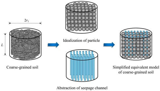 A simplified equivalent model of coarse-grained soil is depicted in Figure 1, which idealizes the soil as a uniform sphere and abstracts seepage channels as parallel capillaries. Assuming the total volume and total surface area of the pore channels of the simplified model are equal to those of coarse-grained soil, the diameter of the pore channels (d0) is given by []: