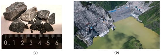 Materials. (a) Materials used for the tests. (b) The construction site of the Lianghekou core-wall rockfill dam.