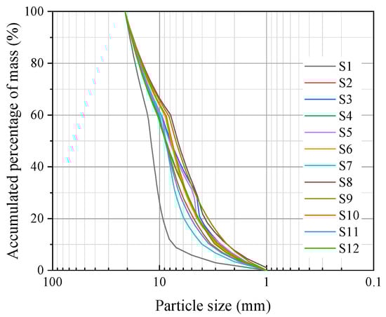 The coarse-grained soil used for the experiment was sourced from blasted tuff at the construction site of the Lianghekou Rockfill Dam, with a grain size ranging between 1 and 20 mm (Figure 3). Located in Sichuan Province, Southwest China, the 295 m high Lianghekou Rockfill Dam serves as the largest hydropower project in the Tibetan region.