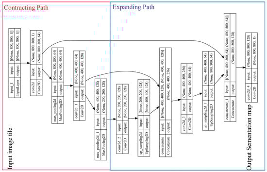 Ronneberger et al. [] proposed a novel Convolutional Neural Network (CNN) named U-Net, a significant advancement in robust and efficient image segmentation. The unique U-shaped structure of U-Net, reminiscent of an autoencoder but exhibiting unique characteristics, divides the network into two separate segments. The schematic diagram of U-Net with an input image resolution of 800 × 800 is shown in Figure 5.