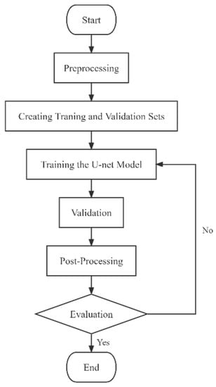 The U-Net CNN workflow designed for the segmentation of coarse-soil CT images is illustrated in Figure 6. This workflow includes six primary steps: preprocessing, generating training and validation sets, training the U-Net model, validation, post-processing, and evaluation.