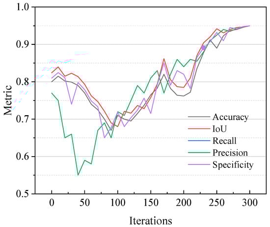 Figure 7 visualizes the segmentation results of our validation set alongside a five-metric evaluation of the ground-truth image. Remarkably, all metrics exceed a value of 0.95 within 300 iterations of the CNN model, demonstrating the robustness of our methodology. It shows its capability to accurately segment CT images of coarse-grained soil, thereby meeting the objectives of this study.