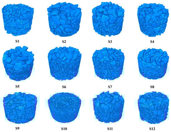 A combination of CT scanning and constant-head permeability tests were carried out on the coarse-grained soil samples. Initially, the specimens were prepared inside a resin-made permeameter, conforming to the test numbers and porosities outlined in Table 1, and following the particle-size distribution curves detailed in Figure 4. The particle-size distribution curves of each specimen (Figure 4) aligned with the original grading of the material from the Lianghekou core-wall rockfill dam quarry, with specimen S1 and S7 representing the upper and lower envelopes, respectively. Table 1 lists the minimum porosity of each specimen under the specified particle size distribution. The specimens, each cylindrical with a diameter of 10 cm and a filling height of 8.5 cm, totaled 12 in number.