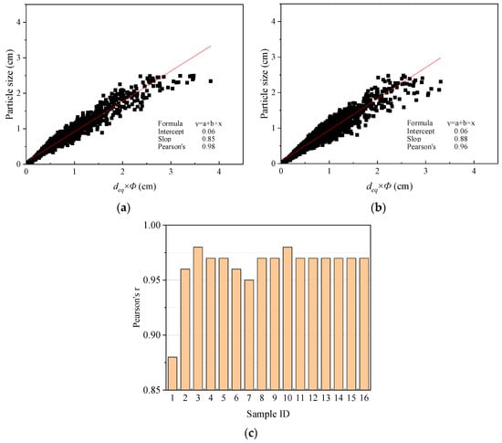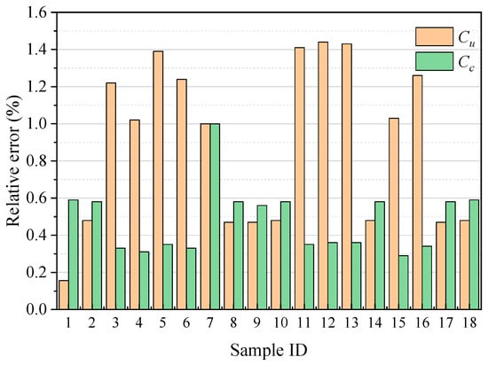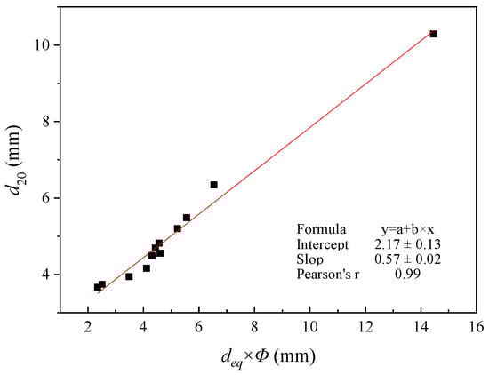 Table 4 and Table 5 indicate a distinct trend: as the ideal particle size of the coarse-grained soil samples increases, there is a concurrent rise in the discount factor. To better define this relationship, we conducted a linear regression analysis using the least squares method. As illustrated in Figure 14, the resulting Pearson correlation coefficient is a robust 0.95, signifying a strong linear correlation between the discount factor and the ideal soil particle size. Therefore, the empirical formula for the discount factor of coarse-grained soil fitted in this article is shown in Equation (25).